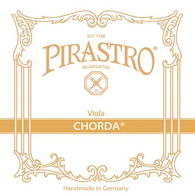 Pirastro Chorda ist eine authentische Bratschensaite für Barockinstrumente mit sehr geringer Saitenspannung. Der Satz besteht aus Darmsaiten, von denen die G- und C-Saite mit Kupfer- oder versilbertem (neuere Versionen) Draht mit Knotenende umwickelt sind. Die Saiten sind in mittlerer Saitenspannung (PM) und auf Sonderwunsch in weicher und starker Ausführung erhältlich (Lieferzeit 4-6 Wochen):