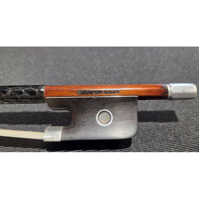 Duitse cellostrijkstok met het merk "Hermann-Knopf", gemaakt door Lothar Hermann in de 20e eeuw. Ronde stok, gemaakt in donkere pernambucokleur. Zilveren montuur. Kikker met Parijse oog. Knop van ebbenhout met een volledig zilveren overlay. 81 gram. Uitstekende staat.